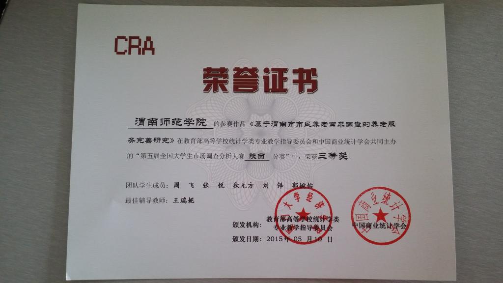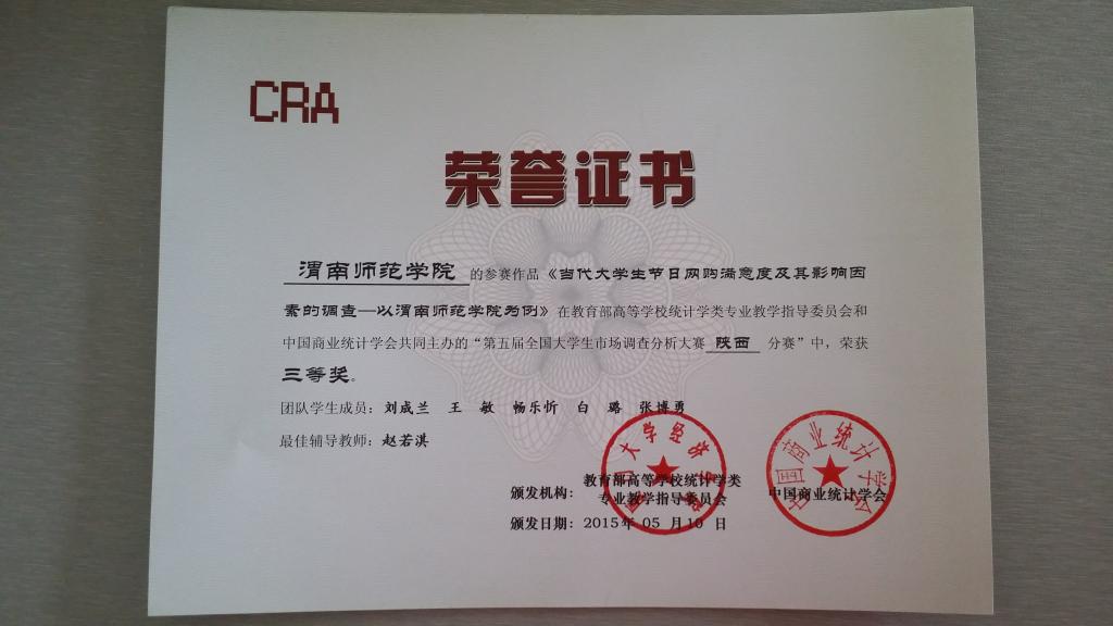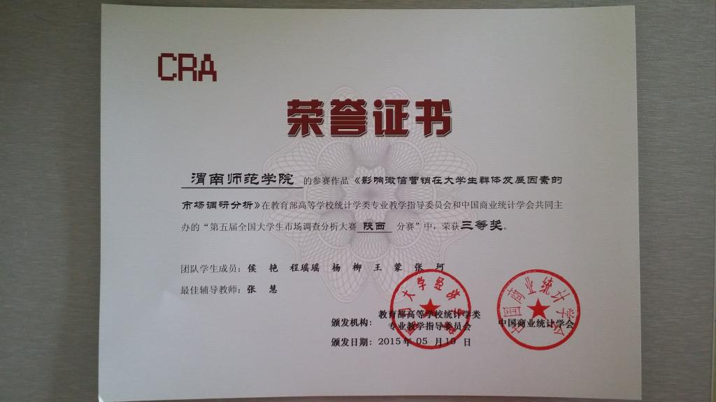 我院派出三支学生团队参赛,侯艳等5名学生(张慧老师指导)参赛作品名称为《影响微信营销在大学生群体发展因素的市场调研分析》、周飞等5名学生(王瑞妮老师指导)参赛作品名称为《基于渭南市市民养老需求调查的养老服务完善研究》、刘成兰等5名学生(赵若淇老师指导)参赛作品名称为《当代大学生节日网购满意度及其影响因素的调查-以太阳成tyc7111cc为例》均获三等奖。