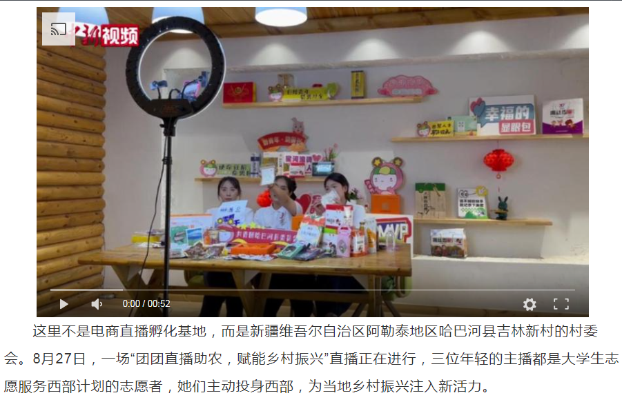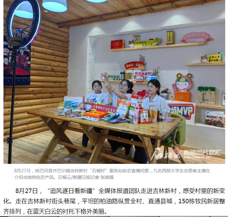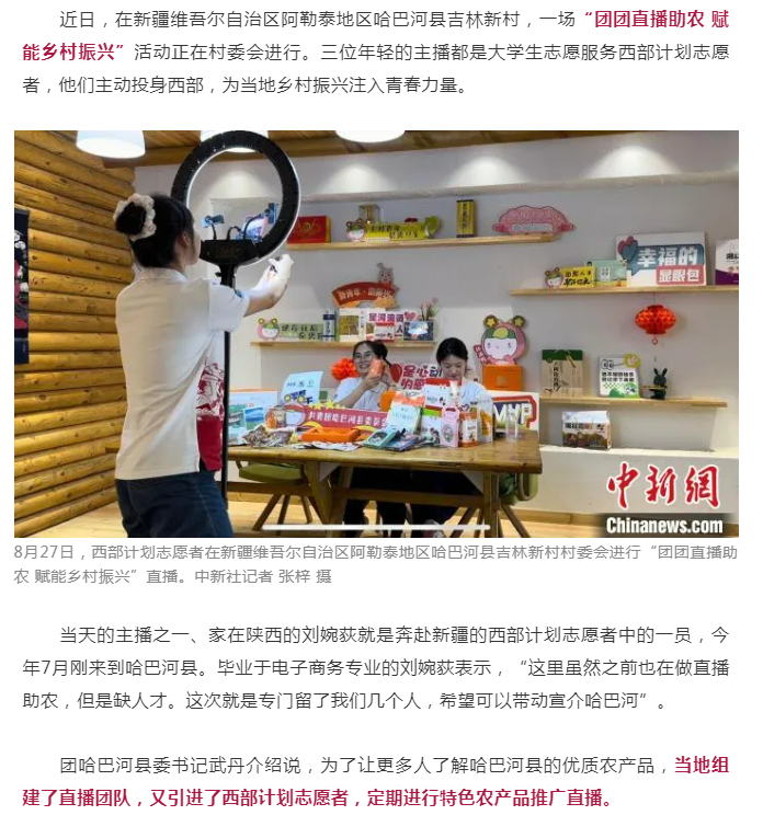 近日,《中国新闻网》《西部志愿汇》《凤凰网》等媒体报道了新疆维吾尔自治区哈巴河县三名西部计划志愿者直播助农的事迹,其中有我校太阳成tyc7111cc集团2024届毕业生刘婉荻。
