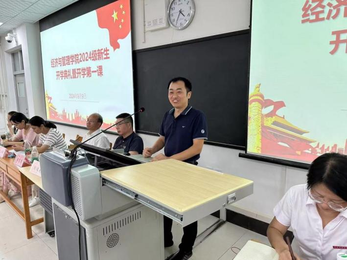 典礼在国歌声中拉开序幕,全体师生肃立,心中激荡着对祖国的无限热爱与崇高敬意。袁梁代表学院全体教师向新生表示热烈欢迎,并寄语新生要珍惜大学时光,勇于探索,敢于创新,努力成为具有社会责任感和国际视野的优秀人才。深入浅出的向新生们介绍了不同专业的魅力,激发了他们对专业知识的浓厚兴趣。鼓励新生们要保持好奇心和求知欲,不断拓宽知识视野,为未来的学术研究和职业发展打下坚实的基础。