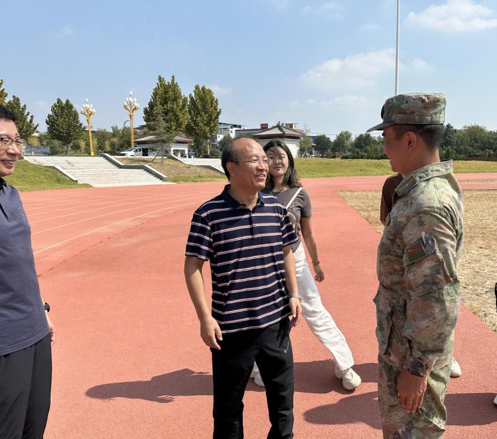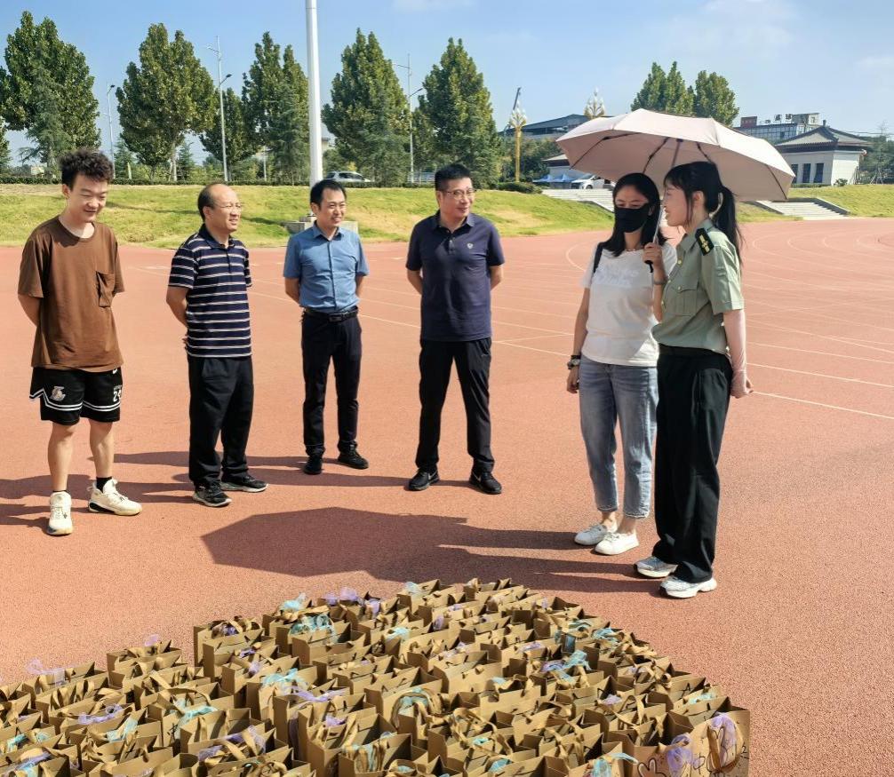 2024年9月17日上午,太阳成tyc7111cc集团党总支书记李富荣、党总支副书记谢稷光,副院长王留鑫,学工办主任朱玉娜以及2024级辅导员米晨一行前往军训场地,亲切慰问正在参加军训的新生和教官。