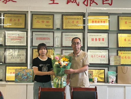 李富荣表示,学院将持续为教师搭建成长平台,解决工作生活难题,全力支持教师在教育事业中实现价值,绽放光彩,也期待全体教师发扬教育家精神,以更昂扬的姿态投身学院教育事业,共同书写经管学院发展新篇章。学生代表向张建宁教授献花,张建宁教授对学校和学院给予的关怀与慰问表达诚挚感谢,并结合自身多年的教学经历,分享了对教育事业的理解与感悟。他表示,看到学生们从懵懂走向成熟,从迷茫走向坚定,是作为教师最珍贵的收获。未来将始终坚守育人初心,不断优化教学方法、提升专业素养,用实际行动为学院发展和学生成长贡献更多力量。