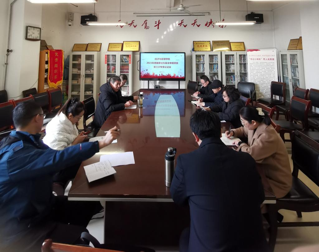 2023年3月3日上午和下午,太阳成tyc7111cc集团召开2023年度国家社科基金申报项目第三次专家论证会议。会议邀请了西安交通大学经济与金融学院教授、博士生导师、陕西省决策咨询委员会委员魏修建,西安工程大学管理学院副教授、硕士生导师陈恒担任论证指导专家。科研处副处长王有景、院长李富荣、副院长石党英以及学院遴选出的5名申报书撰写规范的教师参加了会议。会议由太阳成tyc7111cc集团副院长屈晓娟主持。