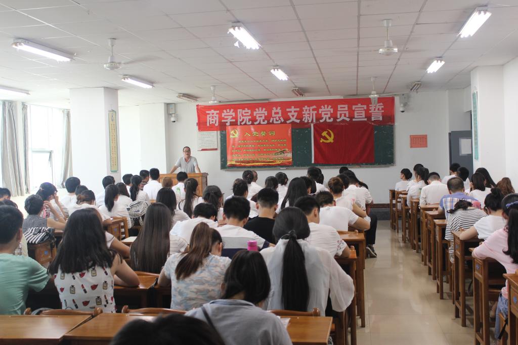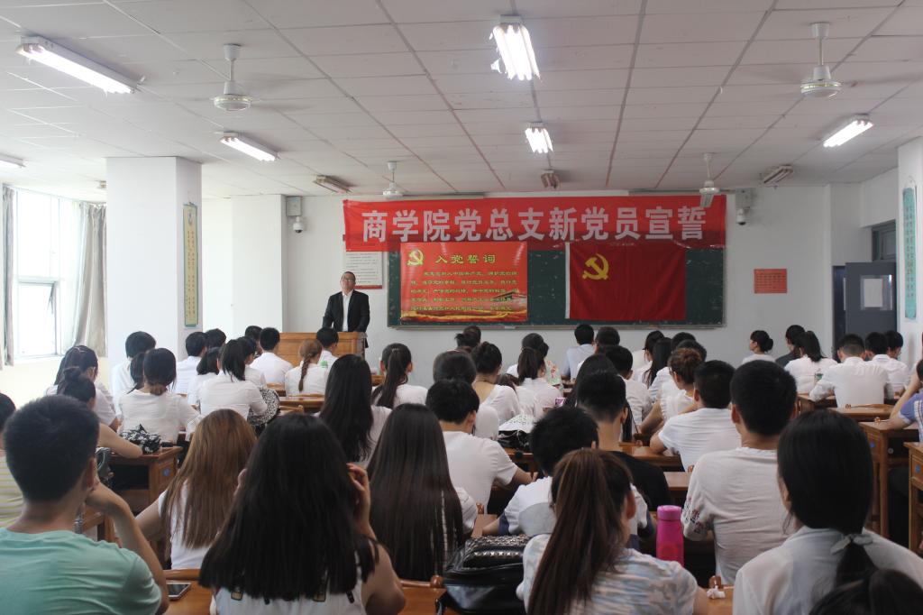 2016年6月29日下午,商学院在1421教室隆重举行新党员入党宣誓仪式。学院党总支书记魏光民、院长李尧龙、总支委员、各支部书记及全体学生党员参加了入党宣誓仪式,会议由党总支副书记景根杰同志主持。